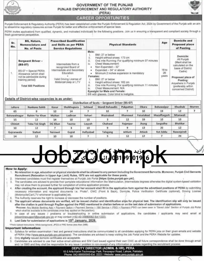 The Punjab Government has announced PERA Sergeant Driver Jobs 2026. These jobs are offered by the Punjab Enforcement & Regulatory Authority (PERA). PERA works to enforce rules and laws in Punjab.